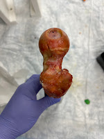 Today, Dr. Cong and I continued physical testing, completing simulated failure, repair, and mechanical testing of two more femurs. Below are three images showing various stages of the testing process.